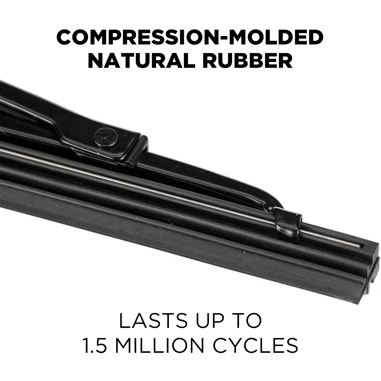 78W Series wipers are designed to OEM standards with a heavy duty steel frame and premium natural rubber, ensuring durability in the most extreme weather conditions. Each wiper includes all necessary hardware and adapters to fit a wide range of truck, bus, RV, and equipment vehicles with a bolt-on connection for both 21mm and 27mm saddle wiper arms. The rubber is compression molded for superior performance and can last up to 1.5 million cycles.