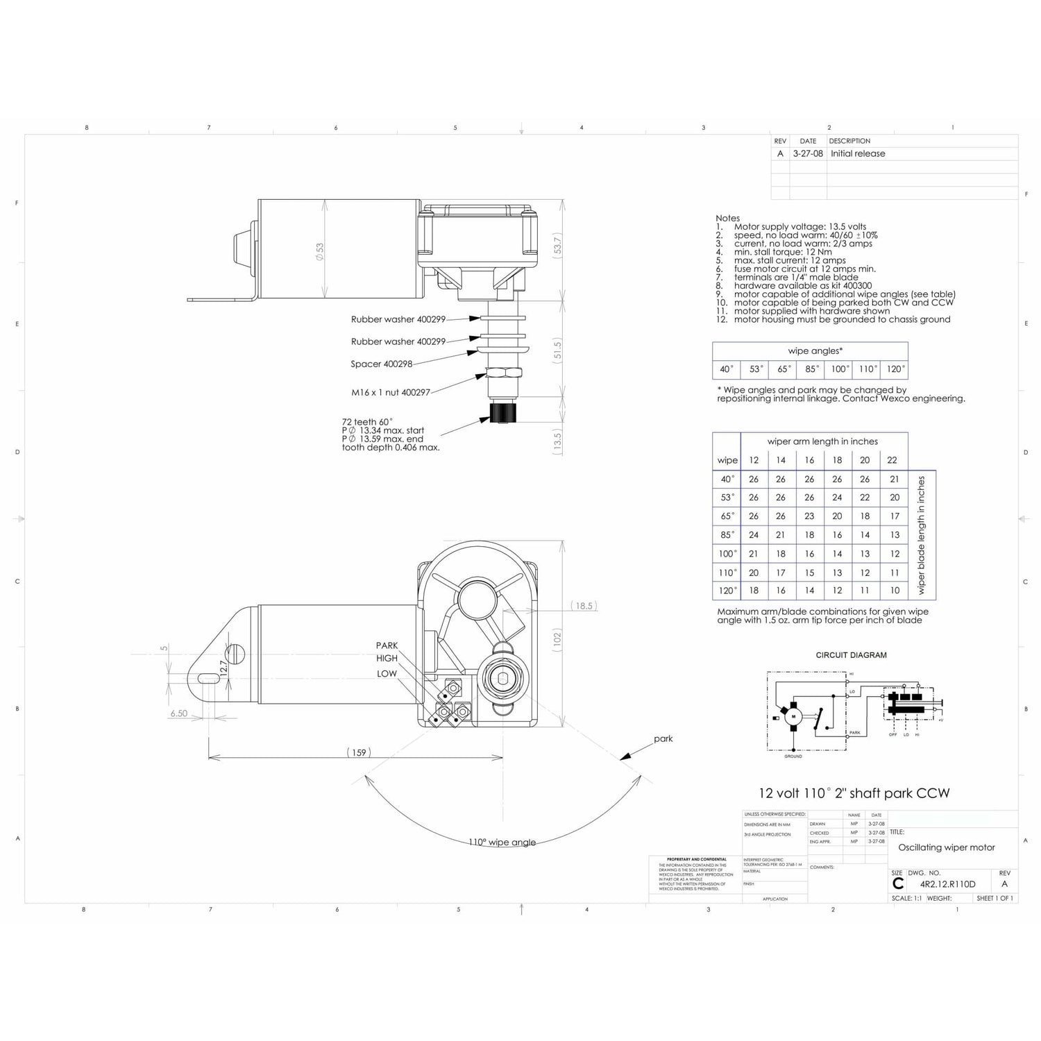 The 4R2.12.R110D is a robust 12V wiper motor from the 4R-Series (WWF), engineered for heavy-duty performance in commercial, industrial, marine, and specialty vehicles. Equipped with a 2.5" shaft, this high-torque motor delivers exceptional durability and reliability for demanding applications. Designed for versatility, it features adjustable sweep angles and compatibility with a wide range of wiper arm configurations, ensuring precise and consistent wiping performance in any environment. Built to withstand harsh weather and rugged conditions, the 4R2.12.R110D provides unmatched strength and adaptability for optimal visibility.